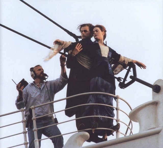 المخرج جيمس كاميرون يشرح لميت وليوناردو مشهد السباحة فى الفضاء.