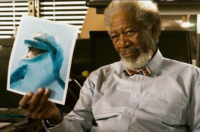 الممثل مورجان فريمان فى لقطة من الفيلم و هو يمسك بصورة للدولفين