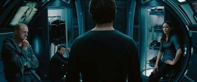 مشهد من فيلم "Mission: Impossible - Ghost Protocol" يجمع بين أبطاله جيريمى رينر، توم كروز، سايمون بيج، و باولا باتون.
