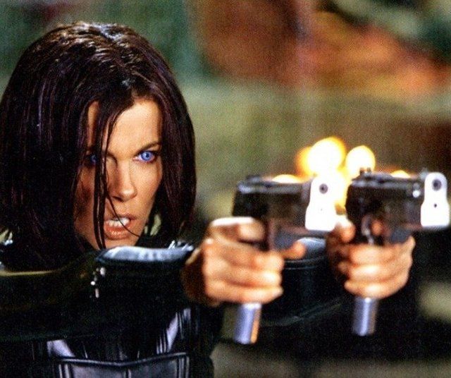 صورة للمثلة كيت بيكنسيل بفيلم (أندرجرواند) وهي تشهر مسدسيها وتطلق منهما الرصاص .