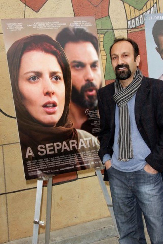 المخرج اﻹيراني اصغر فرهادي بجانب أفيش فيلمه في حفل الترشيحات
