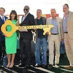فريق عمل فيلم فيجاس الأخيرة يستلمون مفتاح لاس فيجاس أمام فندق بيلاجيو.