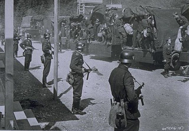 لحظة وصول الأسرى للمعسكر والجنود الألمان متأهبون