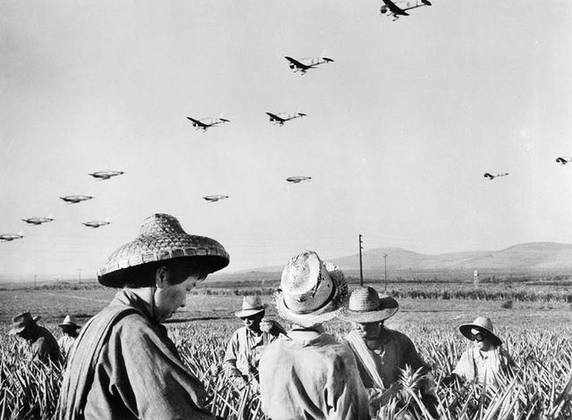 الطائرات اليابانية فى طريقها لتحقيق المفاجئة لضرب ميناء بيرل هاربور وهى تحلق فوق رؤوس الفلاحات وهن يجمعن ثمار الأناناس.
