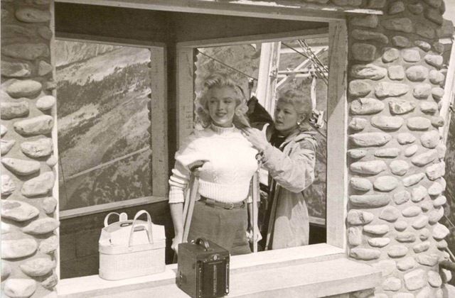مارلين مونرو مع مستشارتها ناتاشا ليتس بعد ان سقطت وأصيب كاحلها ووضعت قدمها فى جبيرة واستخدمت عكازين.
