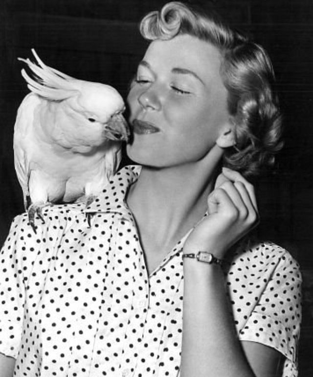 دوريس داى تداعب الببغاء ذو العرف "لويز" وراء الكاميرا أثناء تصوير فيلم Young Man with a Horn عام ١٩٥٠.