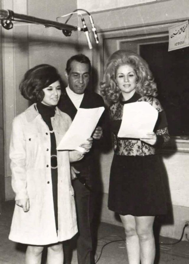 سعاد حسني و صباح والمخرج الإذاعي محمد علوان اثناء تسجيل المسلسل الاذاعي الحب الضائع