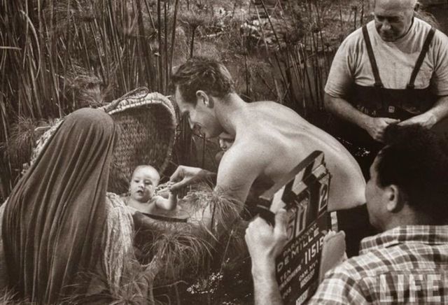 تشارلتون هيستون خلف الكاميرا يداعب الطفل فرازر سى هيستون الذى قام بدور موسى طفلا.