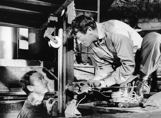 خبير التفجير ديفيد نيفين يضع دائرة التفجير أسفل الأسانسير وجريجورى بيك يساعده.