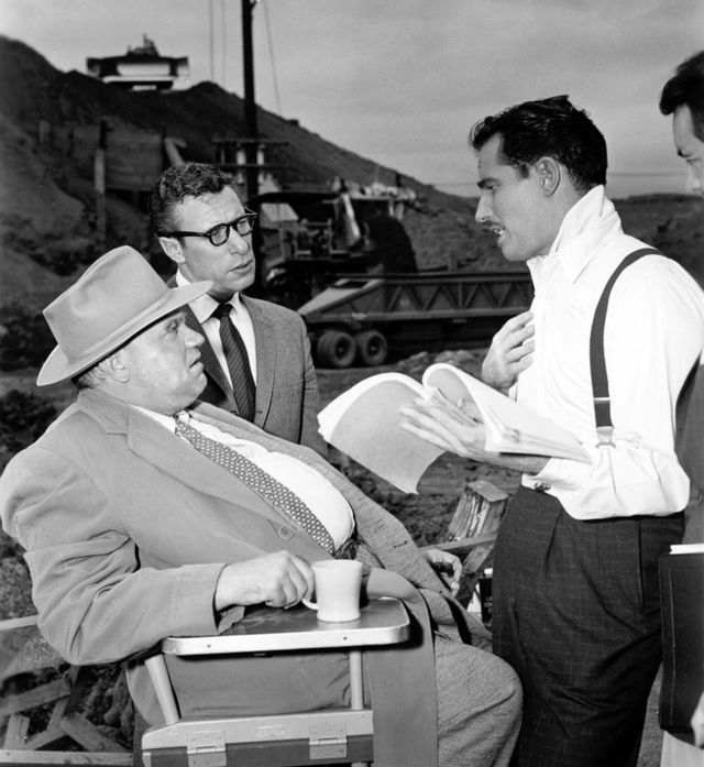 اورسون ويلز و تشارلتون هيستون مع مورت ميلز خلف الكاميرا يراجعون أحد مشاهد فيلم لمسة الشيطان ١٩٥٨.