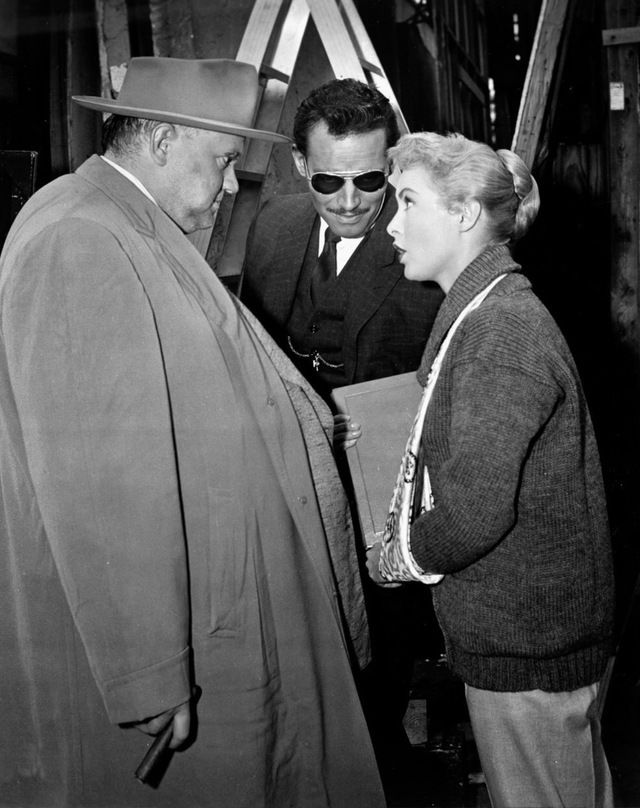 اورسون ويلز و شارلتون هيستون فى الكواليس مع جانيت لى وقد أصيبت فى ذراعها وتستعين بحمالة للذراع أثناء تصوير مشاهد فيلم لمسة الشيطان ١٩٥٨.