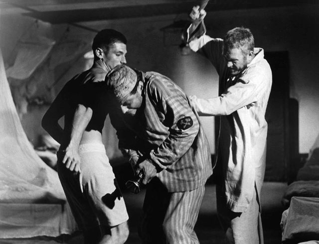 بابيلون بمساعدة الحلاق يضربون احد السجناء المتعاونين مع السجانين لكى يتمكنوا من الهرب.