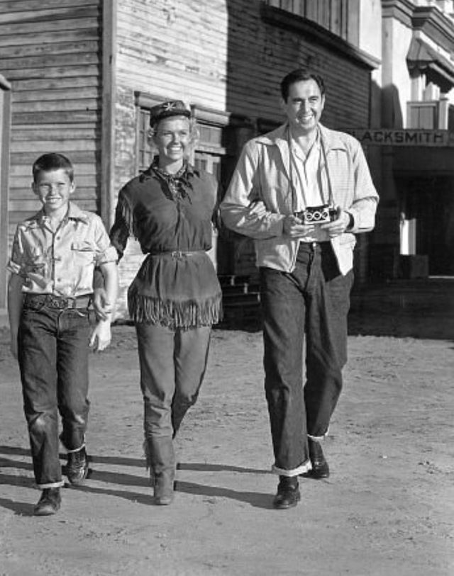 دوريس داى فى كواليس فيلم Calamity Jane 1953 مع زوجها المنتج مارتن ميلشر وإبنها تيرى من زوجها الأول.