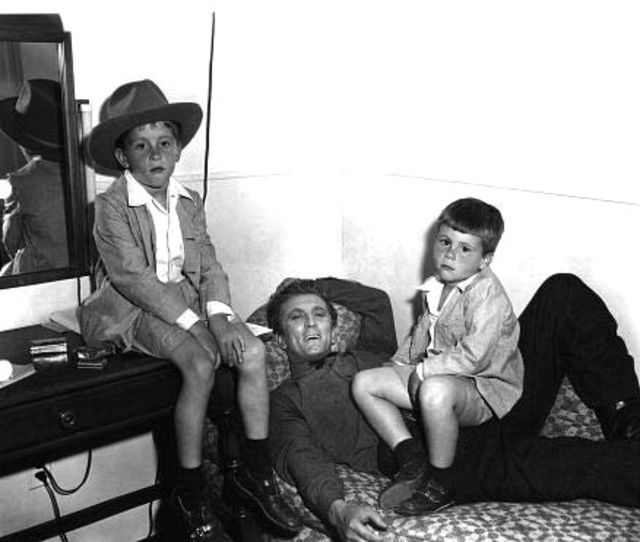 كيرك دوجلاس فى كواليس فيلم The Big Trees مع ولديه الممثل مايكل دوجلاس والمنتج جويل دوجلاس