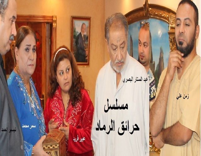 الفنانة عبير فريد و الفنان زمن علي و الفنان ستار البصري و الفنانة سمر محمد في مشهد من مسلسل حرائق الرماد تأليف سلام حربة اخراج رضا المحمداوي سنة 2014