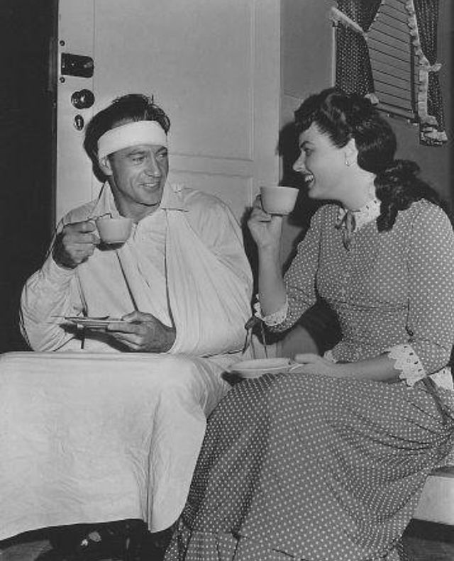 إنجريد بيرجمان و جارى كوبر يتناولون الشاى استعدادا لتصوير المشهد التالى من فيلم Saratoga Trunk 1947.