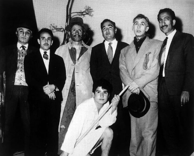 مجموعة (في انتظار گودو) . في الجمعية البغدادية - 1966.... من اليمين يوسف سلمان – الماكيير ، سامي السراج ، سامي عبد الحميد- المخرج. ، هاشم السامرائي ، كاظم الزيدي- مدير المسرح. ، روميو يوسف ، و عوني كرومي- الجالس